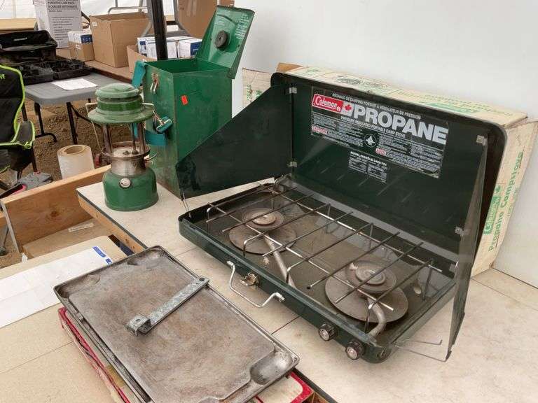 LOT 2014 - Coleman propane stove comes with cast aluminum grill, and a gas lantern globe missing