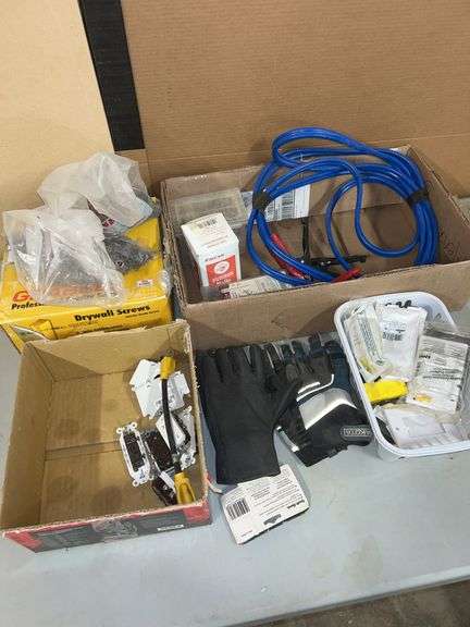 LOT 1029 - Booster cables, drywall screws, gloves, misc electrical supplies