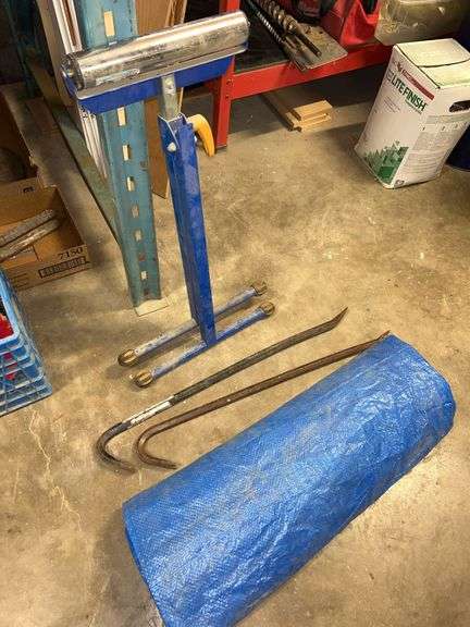 LOT 1115 - Pair of wrecking bars, roller stand, and tarp